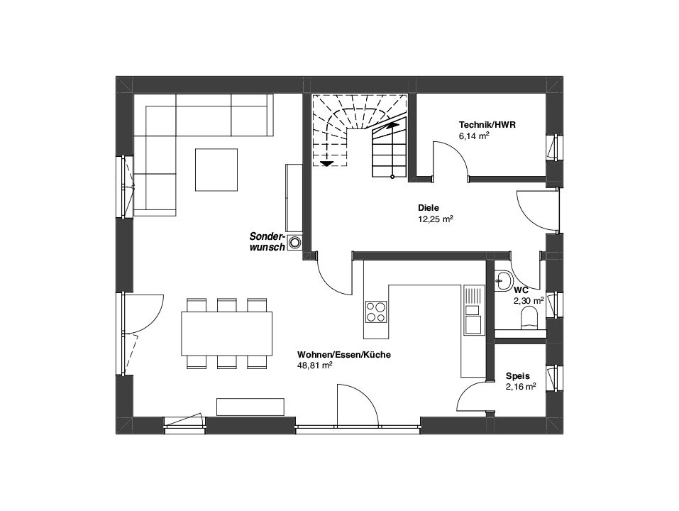• Schornstein als Raumtrenner zwischen Küche und Wohnbereich (Sonderwunsch)